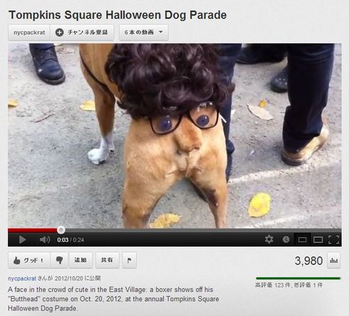 犬の短いしっぽを人間の鼻に見立てて、おしりに黒ぶちメガネと目玉、黒髪のカツラを装着。しっぽをふると人面の鼻がひくひく動く、ユニークな仮装が犬のおしりに完成しています。動画は「トンプキンススクエア・ハロウィン・ドッグパレード」(Tompkins Square Halloween Dog Parade)という、犬に仮装させるイベントで撮影されたもの。日本のハロウィンでもこんな仮装はいかがでしょうか?