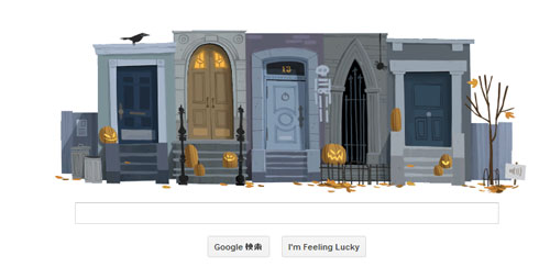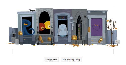 トップページにアクセスすると古い洋館のイラストが現れ、ガイコツがドアをクリックするよう手招きする。5つのドアをクリックするとドアが開いてお化けが登場し、「Google」のロゴを形作る。最後に左端のバケツをクリックすると黒ネコが飛び出してきて、画面が「ハロウィン」の検索結果に変わる。