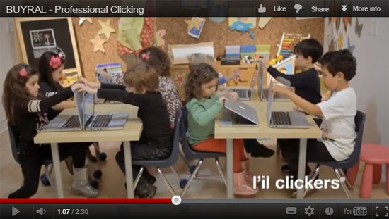 サービスのプロモーション動画によると、お金を払えば、世界中のBuyralのスタッフがひたすら人力でクリックして、アクセスを増やしてくれるという仕組み。おじいちゃんおばあちゃんや子どもたちも動員したり、エレベーターやゲームセンターにボタンを仕込んだり……ここまで来ればお分かりと思いますが、これはジョーク。冗談ながらもリアルでありそうな出来なのが受けているようです。