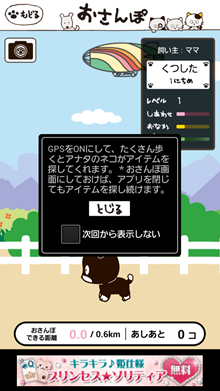 「おさんぽ」ではGPSをONにして移動した距離に応じて懐かしいアイテムなどいろいろな物を拾ってきてくれます。
