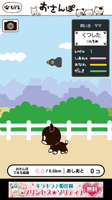 画面下のステータスはピンクの数字が1回のおさんぽで移動した距離、黒い数字は1回のおさんぽで移動できる距離(レベルが上がると距離が増えます)、あしあとはアイテム取得条件となります。