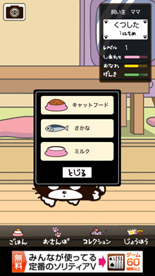 「ごはん」をタップするとキャットフード、さかな、ミルクの3種類あるのであげたいものをタップしておなかを満たしてあげましょう。