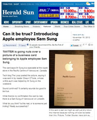 オーストラリアの新聞「ヘラルド・サン」は19日、カナダ・バンクーバーのアップルストアに勤めるスペシャリスト、サム・スン氏(Sam Sung)が名刺を公開し、話題になっていると報じた。