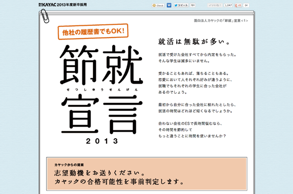 そんな中、毎年学生のみならずネット上で注目を集めるのが、面白法人カヤック。昨年は「節就宣言」と銘打ち、カヤックの志望動機、また他社の志望動機をそのまま提出するだけで合格可能性を事前判定するなど、ユニークな施策を展開した。今年はどのような変わり種採用を展開するのだろうか。カヤック社長の柳澤大輔氏、人事の柴田史郎氏に話を聞いた。取材の最後には、就活生が持っているであろう疑問を柳澤社長に相談してみた。