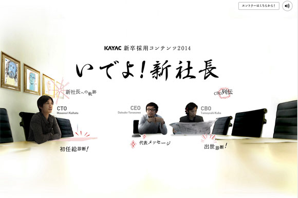 今年の就活特設サイトのコンセプトは、ずばり「いでよ! 新社長」。カヤックの経営陣であるCEO(最高経営責任者)、CTO(最高技術責任者)、CBO(最高ブランド責任者)となる人材を募集するという。