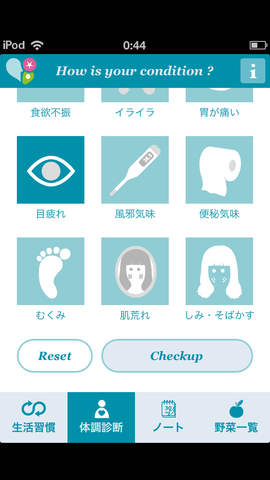 次に、「体調診断」で今のコンディションを選びタップしていき「Checkup」をタップするとオススメの野菜が表示されます。