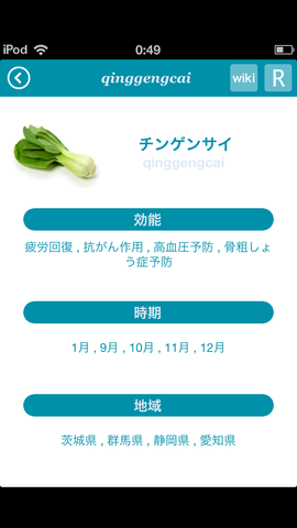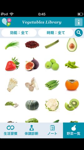 「野菜一覧」では疲労回復や風邪予防などの効能、旬の時期を選んで野菜の効能、時期、地域、食べ方をチェックすることができます。