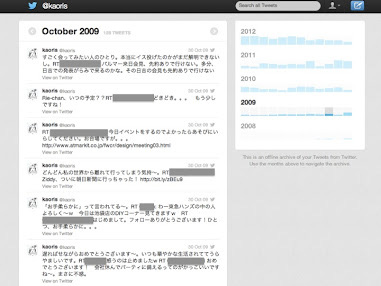 この機能では自分の過去のツイートとリツイートを見ることができ、過去の自分の発言を振り替えることができる。月ごとにツイートを閲覧したり、キーワードやフレーズ、ハッシュタグや@ユーザーネームで検索可能。