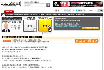 ドワンゴは12月24日、18日に逝去した将棋連盟会長・米長邦雄さんの追悼特別番組「ありがとう米長会長 -プロ棋士、会長としての人生を振り返る-」をニコニコ生放送で配信する。午後7時から。