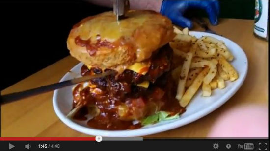 Atomic Burgersはこのバーガーを1時間で食べられるかチャレンジする「Fallout Challenge」を実施しているのですが、参加するには25ポンドの料金に加え、何があっても店側の責任を追及しませんという書類にサインしなくてはいけません。18歳未満はチャレンジ禁止、食べるときは保護グローブ着用と、なんとも恐ろしいバーガーです。