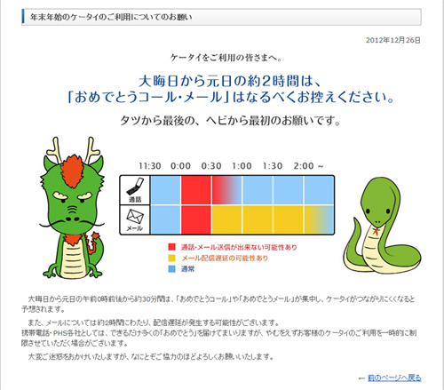 大みそかから元日の午前0時前後から約30分間、あけましておめでとうの電話やメールが集中して携帯電話がつながりにくくなると予想され、メールについては約2時間にわたって配信遅延が発生する可能性がある。キャリア各社は、「やむをえずお客様のケータイのご利用を一時的に制限させていただく場合があります」としている。