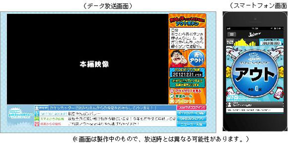 「アウトボタン」は番組連動データ放送と特設スマートフォンサイト「JoinTV」に表示され、番組を見て笑ってしまったときに自己申告で押す。どんなシーンでどれくらいボタンが押されたか、日本全国のデータを集計して表示する。FacebookやTwitterでアウトをシェアすることも可能だ。