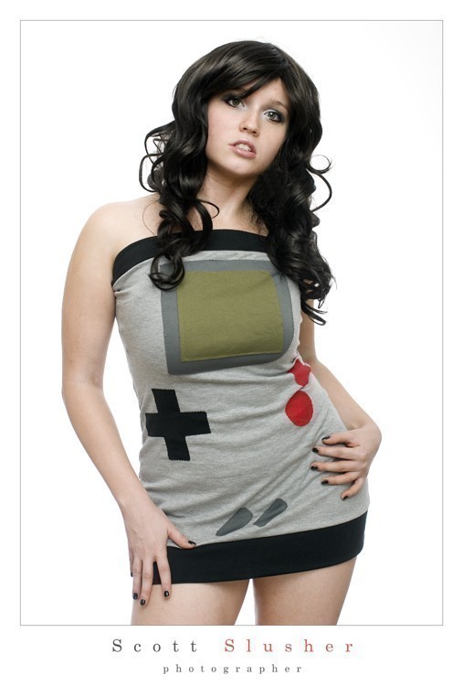 グレーのニットでできたドレスは、本物のゲームボーイに似せてスクリーンや十字ボタン、ABボタンなどが縫い付けられています。肩紐がなくチューブトップのようにセクシーですが、別売り(5ドル)の肩紐をつけることもできます。