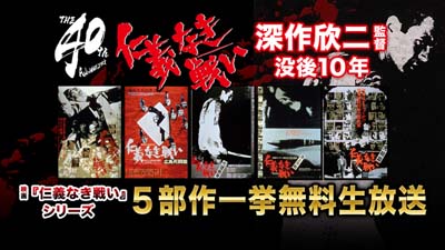 シリーズ公開40周年を記念した企画。「仁義なき戦い」とそれに続く「広島死闘篇」「代理戦争」「頂上作戦」「完結篇」の5作を上映するほか、池袋文芸坐(東京・池袋)で行われる千葉真一氏トークショーのもようも生中継する。