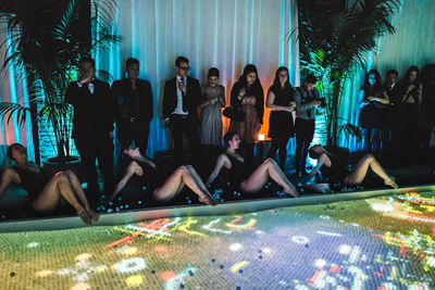 ショーでは6万5000個のピンポン球でプールを覆い尽くし、色とりどりの映像を映します。カラフルな光が模様を描いて動くさまは美しく、招待客は引き寄せられるようにプールに飛び込んでいきます。さらに映像投映とシンクロナイズドスイミングを組み合わせた特別パフォーマンスも