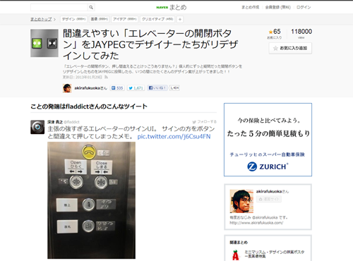 発端は「主張の強すぎるエレベーターサイン」に遭遇した人物のツイート。ボタンよりも、真上に付いていた「ひらく」「しまる」のサイン表示の方が大きかったため、間違えてサインを押してしまったそうです。これをきっかけにデザイナー用のWebサービス「JAYPEG」で、分かりやすい開閉ボタンのデザインを募ったところ大盛り上がり。多くのユーザーによる作品群は、NAVERまとめにまとめられています。