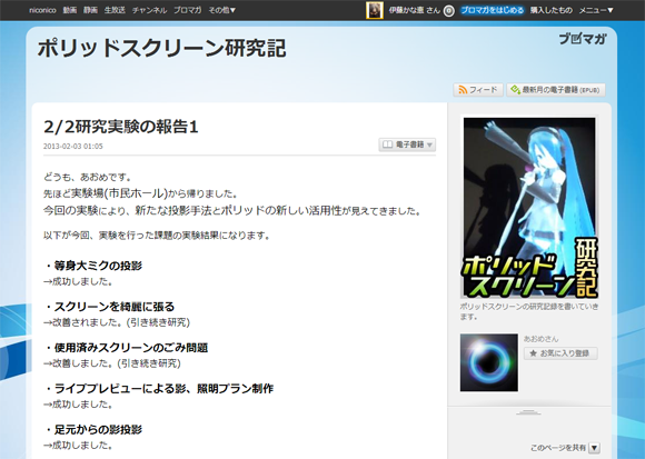 新型スクリーンの開発・研究を行っているのは、あおめさん。昨年秋、台湾で開催された初音ミクのコンサート「ミクパ♪」をきっかけにたった1人で活動を始め、今年1月からほぼ週刊ペースで“実験成果”を投稿している。