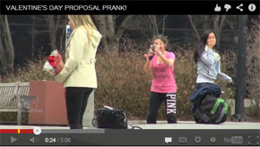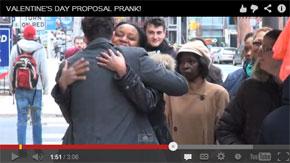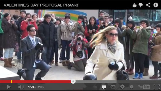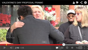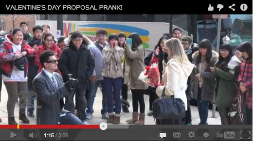 仕掛け人の男性は公園や通りなど人の集まる場所で、同じく仕掛け人の女性に花束を渡し、指輪を手にひざまづきます。しかし、劇的な場面に居合わせて興奮する人たちの目の前で、女性は花束を捨てて去って行きます。