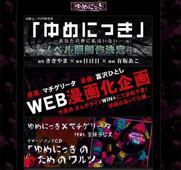 タイトルは「ゆめにっき−あなたの夢に私はいない−」(仮)。ききやまさん原作で、執筆は「ささみさん@がんばらない」などで知られるライトノベル作家の日日日さん、挿絵は有坂あこさんが担当する。PHP研究所から発売の予定。