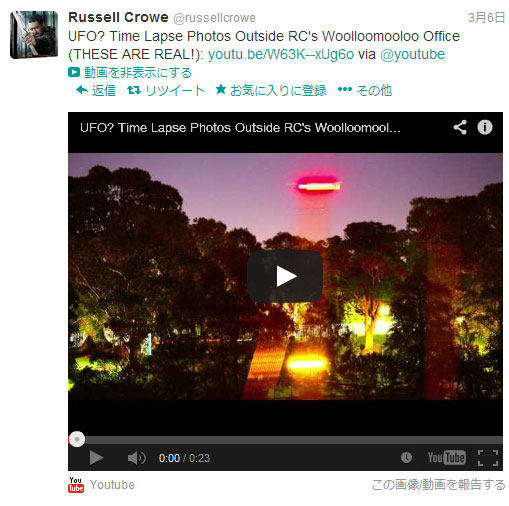 UFOか? 俳優ラッセル・クロウさんが謎の発光体を撮影しYouTubeに投稿