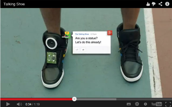 Talking Shoeは加速度計、ジャイロスコープ、圧力センサー、Bluetooth、スピーカーなどの技術を搭載したスニーカー。ユーザーの動きを検知して、ワイヤレスで携帯端末のWebアプリに送信します。アプリはその情報を解析してユーザーに話しかけたり、Google+にコメントを投稿したりします。例えばユーザーが休んでいると「退屈だ」、走り出すと「靴ひもに風が当たる感触が好きだ」といったように。
