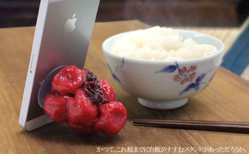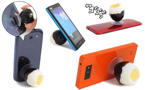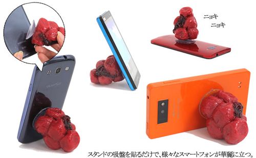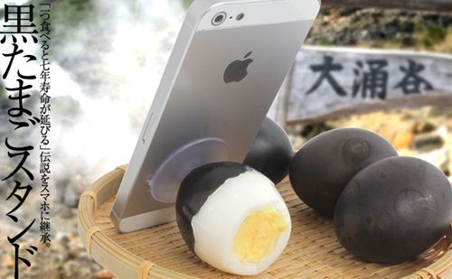 アジの開きのiPhone 5カバー(3990円)は小田原名産・アジの開きをカバー背面にどーんと載せ、梅干しスタンド(1680円)はモコモコとした梅干しの集合体を吸盤でスマホの背面に付けるようになっている。黒たまごのスタンド(1680円)は、「食べれば7年寿命が延びる」と言われる箱根の大涌谷の特産黒たまごの殻をむいたデザインだ。