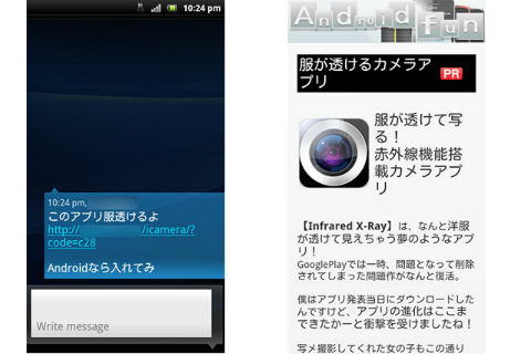 シマンテック公式ブログによると、「このアプリ服が透けるよ」というSMSメッセージが表示され、「Androidなら入れてみ」の誘い文句に従ってアプリをインストールすると、被害者の連絡先にスパムを送信する Android マルウェアに感染してしまう。