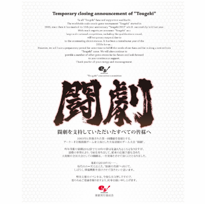 対戦型格闘ゲームの全国大会「闘劇」が終了する。公式サイトには「闘劇を支持していただいたすべての皆様へ」と題したメッセージが掲載されている。