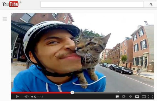 自転車で走る飼い主の肩に乗っかったネコの動画がかわいらしいです。アクションカメラGoProで撮影した映像が公開されています。