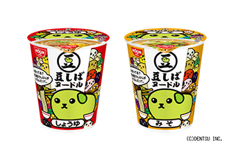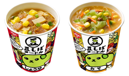 日清食品は4月22日、「豆しば」をキャラクターに使ったカップ麺「豆しばヌードル しょうゆ」「豆しばヌードル みそ」を発売する。
