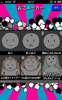 作り方は簡単。怒り顔の写真を撮るか、ライブラリから画像を選択して、6枚の画像を6段階の表現――「おこ」「まじおこ」「激おこぷんぷん丸」「ムカ着火ファイアー」「カム着火インフェルノォォォォオオウ」「げきオコスティックファイナリアリティぷんぷんドリーム」にセットするだけ。完成した画像はTwitterやFacebookに投稿できます。オリジナルの“6段活用”を作ってみると意外と面白いかもしれません。