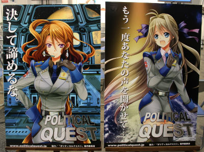「ニコニコ超会議2」展示ホール3の民主党ブースで奇妙な光景に遭遇した。「ポリティカルクエスト」なる萌えキャラたちの映像やポスターが大きく展示されているのだ。なんでもこれは有志による永田町・霞ヶ関の実情をアニメ化するプロジェクトで、先の衆議院選で大敗した「民主党」にスポットを当てたものになるとのこと。