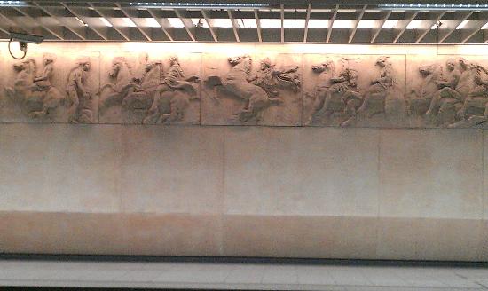ホームの壁面をパルテノン神殿のレリーフの複製品が飾っている
