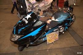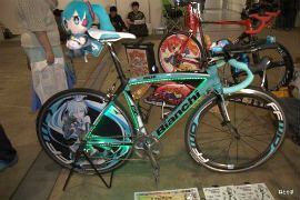 痛車以外にも痛単車や痛チャリも展示されていたが、イタリアの名車ビアンキも日本人の手にかかるとこの通りの痛チャリに