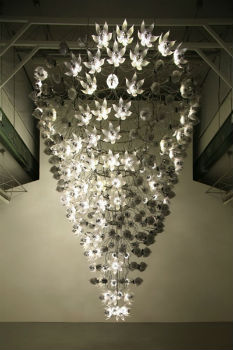 「Una Lumino」と呼ばれるこの作品は、金属でできた花がシャンデリアのように多数連なっている。それぞれの花にはLEDやモーターがついており、つぼみが開きと光り、閉じると明かりが消える。作者Choe U-RamさんはUna Luminoに「群れで活動する新種の機械科学生命」というフィクションの解説をつけているが、確かにSF作品に登場しそうだ。