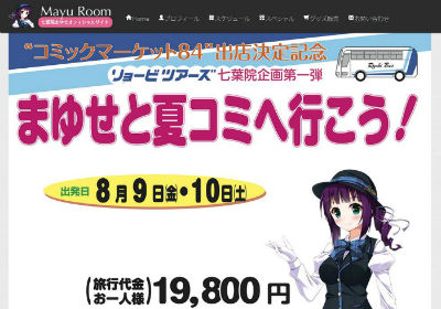 その七葉院まゆせがコミケに出店する。詳細は現時点では不明だが、出店記念に「まゆせと夏コミへ行こう!」バスツアーを開催。岡山発で2泊(車中泊)3日、1人1万9800円となっており、まゆせ限定グッズなどの特典が付いてくる。5月31日まで先行予約を受け付け、6月17日に発売する。