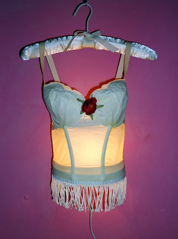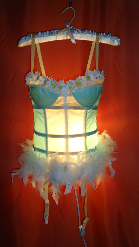 実際に売られている下着を液剤や刺しゅう枠で補強し、ランプシェード代わりにしたもの。コードや電球がセットになっていて、ハンガーでぶら下げて、壁のコンセントにつなぐことができる。