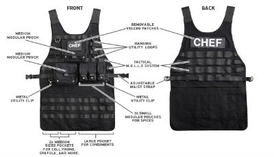 フライ返しなどのツールを差せるリングや、調味料を入れられるポーチ、ポケットがついていて、胸には燦然と輝く「CHEF」の文字。ウエスト部分はストラップで調節でき、ぴったりとフィットさせることも可能だ。まさにフル装備。ただし弾丸を止めることはできないので、あくまでも調理にのみ使うことをおすすめする。
