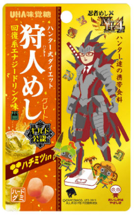 UHA味覚糖からは「携帯食料グミ」が登場。携帯食料アイコンをモチーフとした肉型のグミで、味はエナジードリンク味だ。さらにハードグミ「忍者めし」とコラボした「狩人(ハンター)めし」も発売する。ゲーム内アイテムをイメージした回復系エナジードリンク味のハチミツ入りハードグミとなる。いずれも8月19日発売。