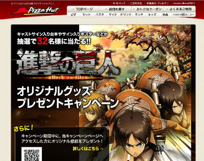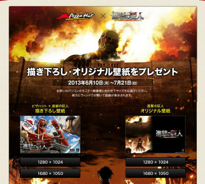 ピザハットは6月10日、アニメ「進撃の巨人」とタイアップしたキャンペーンを開始した。壁紙がもらえるほか、抽選でグッズも当たる。期間は7月21日まで。