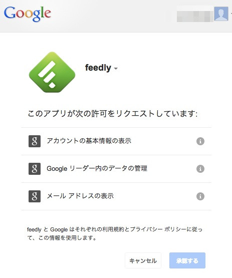 上記のボタンをクリックするとfeedlyがGoogleリーダーの情報にアクセスすることを許可するか確認するダイアログが表示されるので、内容を確認し承諾する。