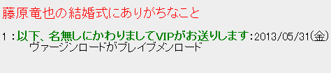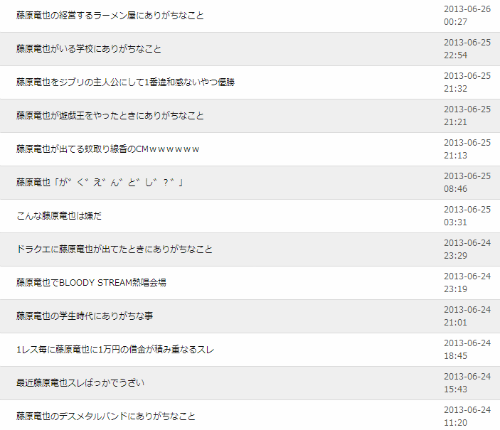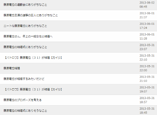 そして、流行中の「○○にありがちなこと」ですが、こちらは今年5月末に藤原さんが開いた結婚会見が発端のようです。「年内に結婚する」との発表後に、「藤原竜也の結婚式にありそうなこと」のスレッドが立ち、以降、ニュー速VIP板の定番ネタとして毎日投稿されるようになります。1カ月間で生まれた藤原さん関連のスレット数は約150本! 実は、各スレッドの書き込みはあまり多くないのですが、まとめサイトに部分的に取り上げられることで、Twitterなどのブームに繋がっているようです。