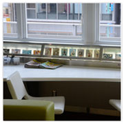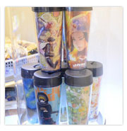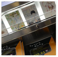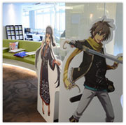 そんな空間に、イラスト入りのポストカードやクッションが自然に置かれている。ここは秋葉原の献血ルームであり、マンガも数多く置いてあるスペースだ。プロのイラストレーターの作品がおいてあるのも当然である、と思いながらながめていると、それらはすべてJAMの生徒の作品だと説明され、2度目の驚きとなった。生徒の作品はそれだけでなく、モニターに流れるアニメーションや、入り口にあるショーウィンドウに展示されているパネルにいたるまで、すべて生徒が在校中に完成させた作品であるというくわしい説明を聞き、心の底から驚かされた。
