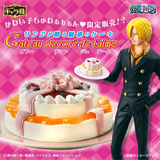 コックのサンジが腕によりをかけて美しい女性達のために作ったデコレーションケーキとして提供。直径約15センチの2段重ねの丸形ケーキで、「麦わらの一味」をイメージした食材やモチーフでトッピングした。ケーキのミニチュアを持ったサンジのフィギュアがついてくる。