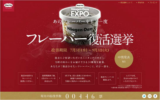過去に販売したミニカップ24種類の中から復活してほしいフレーバーへの投票をネットで受け付けており、1位になったフレーバーを抽選で1000人にプレゼントする。投票は9月3日まで。
