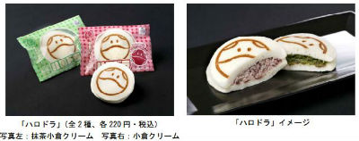 ハロを描いたもちもち食感の白い生地にクリームをはさんだ。抹茶小倉クリームと小倉クリームの2種類。