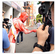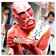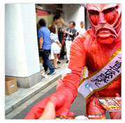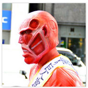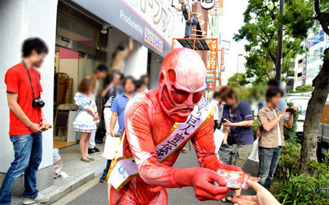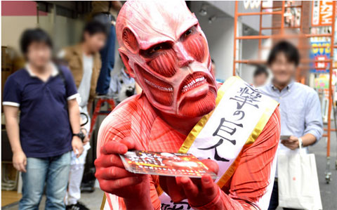 『進撃の巨人』痛フェラーリは、本作の第1・2話を収録したBlu-ray Disc(以下、BD)&DVD1巻、そしてオープンを翌日18日に控えた「AKIBA ドラッグ&カフェ」のPRを目的として公開された。宣伝隊長に任命された1.8メートル級の“小さな”超大型巨人。“小さな”超大型巨人は痛フェラーリとともに秋葉原へ突如現れ、PR活動に精を出した。