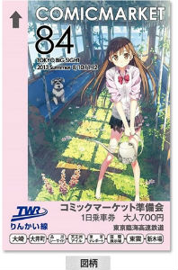 りんかい線全線(新木場〜大崎間)が1日乗り放題で、価格は700円。絵柄はコミケ84のカタログと同じになっている。8月2日からりんかい線各駅(大崎駅除く)の有人改札口で販売する。販売数は2000枚。