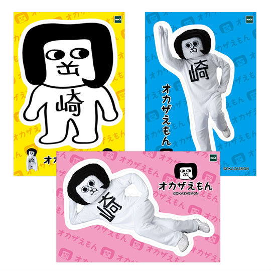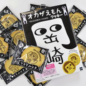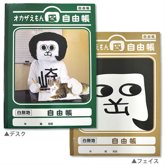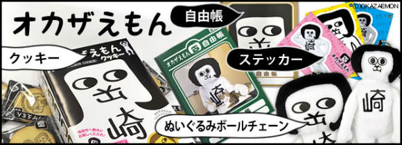 グッズは自由帳(315円)、ステッカー(315円)、ぬいぐるみボールチェーン(609円)、クッキー(10枚入り753円)の4種。自由帳はオカザえもんのどアップと、ネコをなでている姿の2種類、ステッカーは3色、ぬいぐるみボールチェーンはイラスト風とリアル風の2種類となっています。クッキーはオカザえもんのプリント入り。