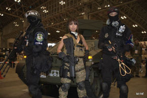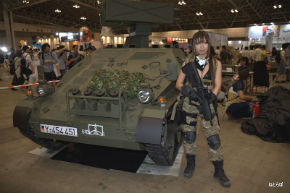 ホールに展示されていた実物大のウィーゼル空挺戦闘車と軍事専門誌「SATマガジン」のミリタリーアイドルITSUYAさん。偵察にやってきた自宅警備隊と